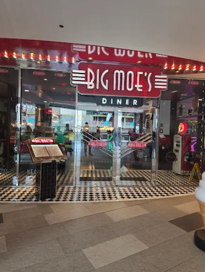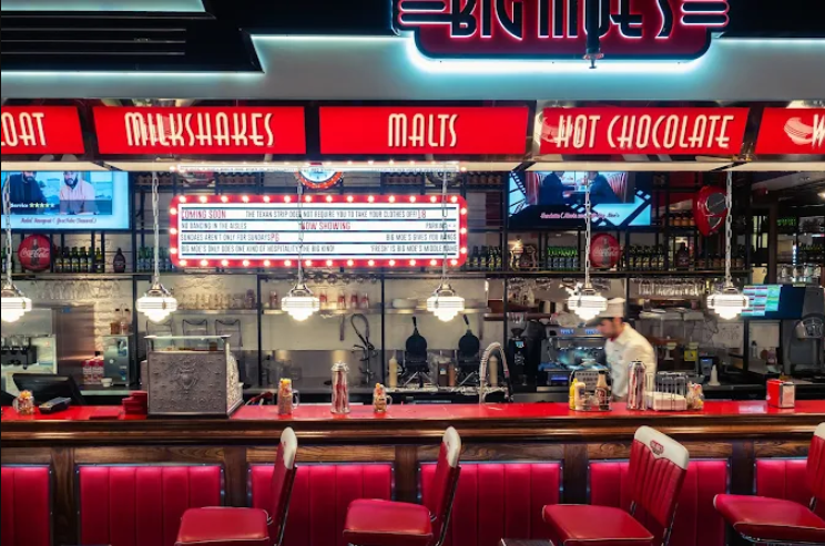 Walking into Big Moe’s feels like stepping into a cinematic 1950s diner—leather booth seating, checkered floors, neon accents, and retro memorabilia throughout.